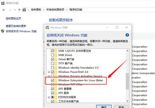 2、搜索“程序和功能”,选择“开启或关闭Windows功能”,开启Windows Subsystem for Linux (Beta),并重启系统。