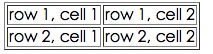 <table border="1"> <tr> <td>row 1, cell 1</td> <td>row 1, cell 2</td> </tr> <tr> <td>row 2, cell 1</td> <td>row 2, cell 2</td> </tr> </table>