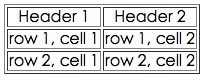 <table border="1"> <tr> <th>Header 1</th> <th>Header 2</th> </tr> <tr> <td>row 1, cell 1</td> <td>row 1, cell 2</td> </tr> <tr> <td>row 2, cell 1</td> <td>row 2, cell 2</td> </tr> </table>
