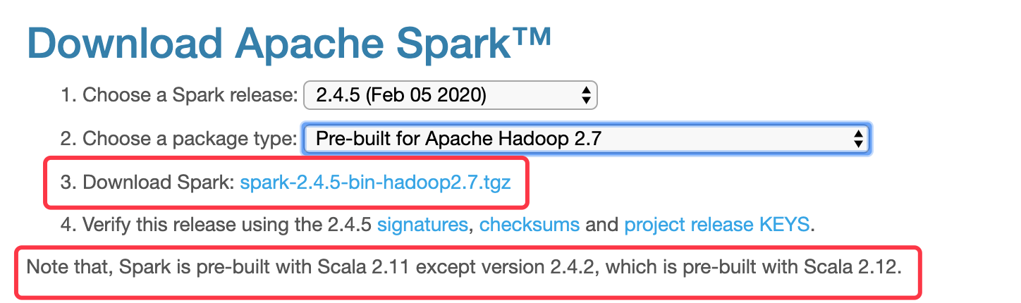 注意提示信息,及Hadoop版本(与已有环境匹配,如果不匹配则选非预编译的版本自己编译)。