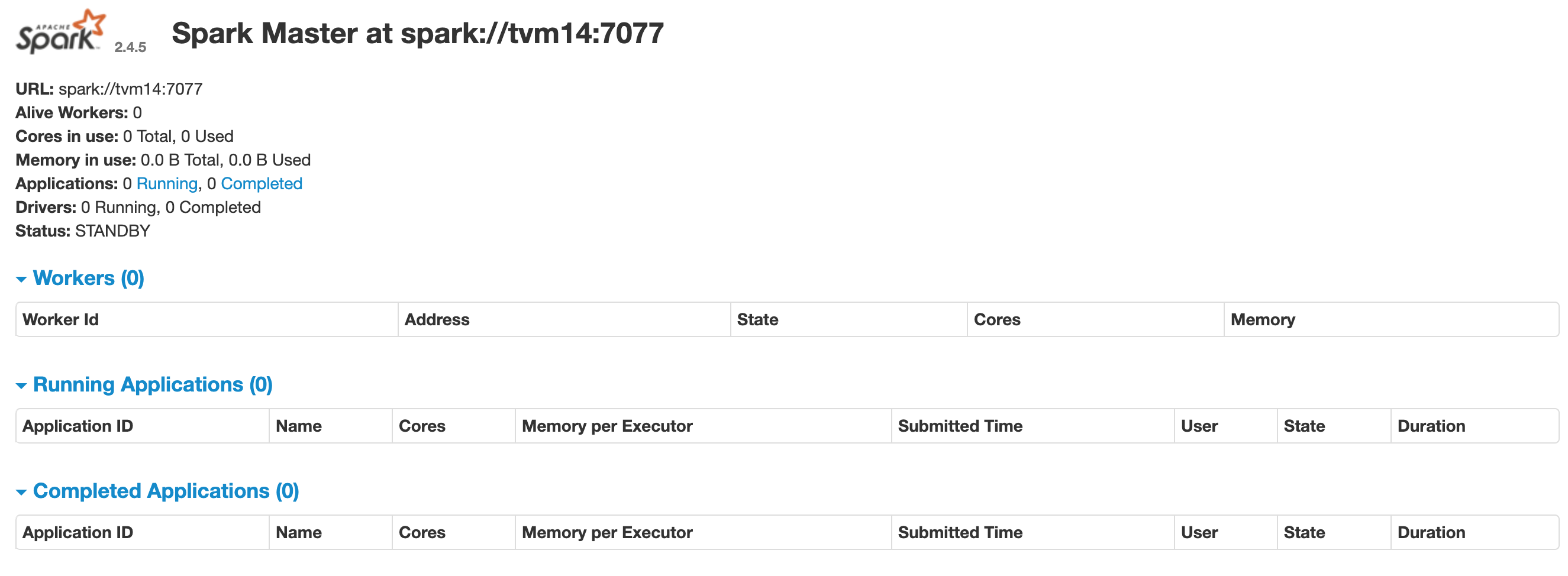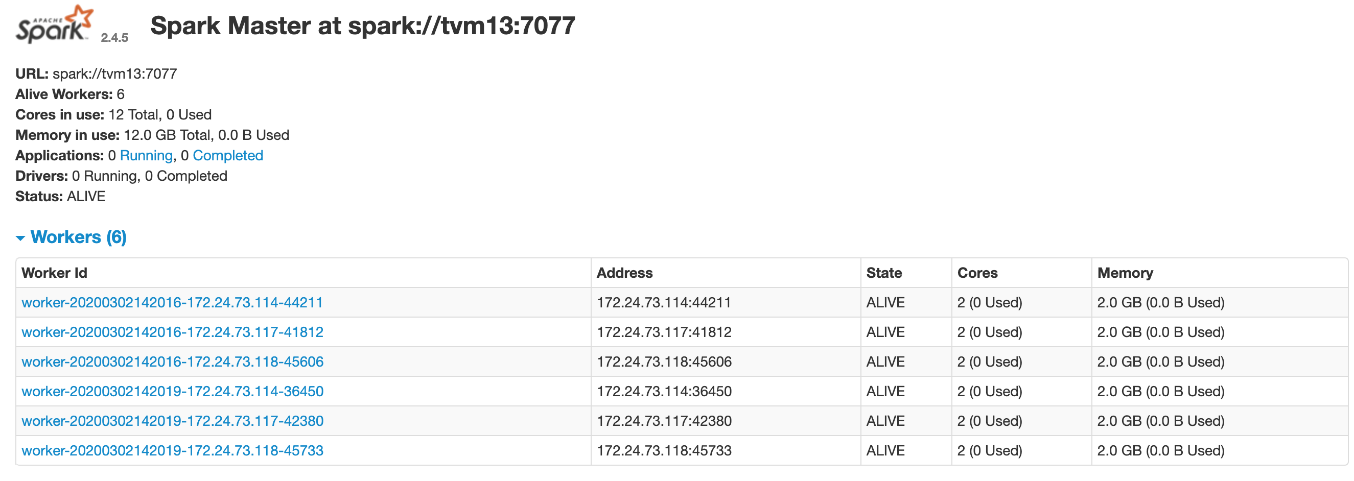 export JAVA_HOME=/data/template/j/java/jdk1.8.0_201 export SCALA_HOME=/data/template/s/scala/scala-2.12.10 export SPARK_WORKER_MEMORY=2048m export SPARK_WORKER_CORES=2 export SPARK_WORKER_INSTANCES=2 export SPARK_DAEMON_JAVA_OPTS="-Dspark.deploy.recoveryMode=ZOOKEEPER -Dspark.deploy.zookeeper.url=tvm11:2181,tvm12:2181,tvm13:2181 -Dspark.deploy.zookeeper.dir=/data/template/s/spark"