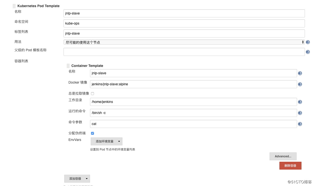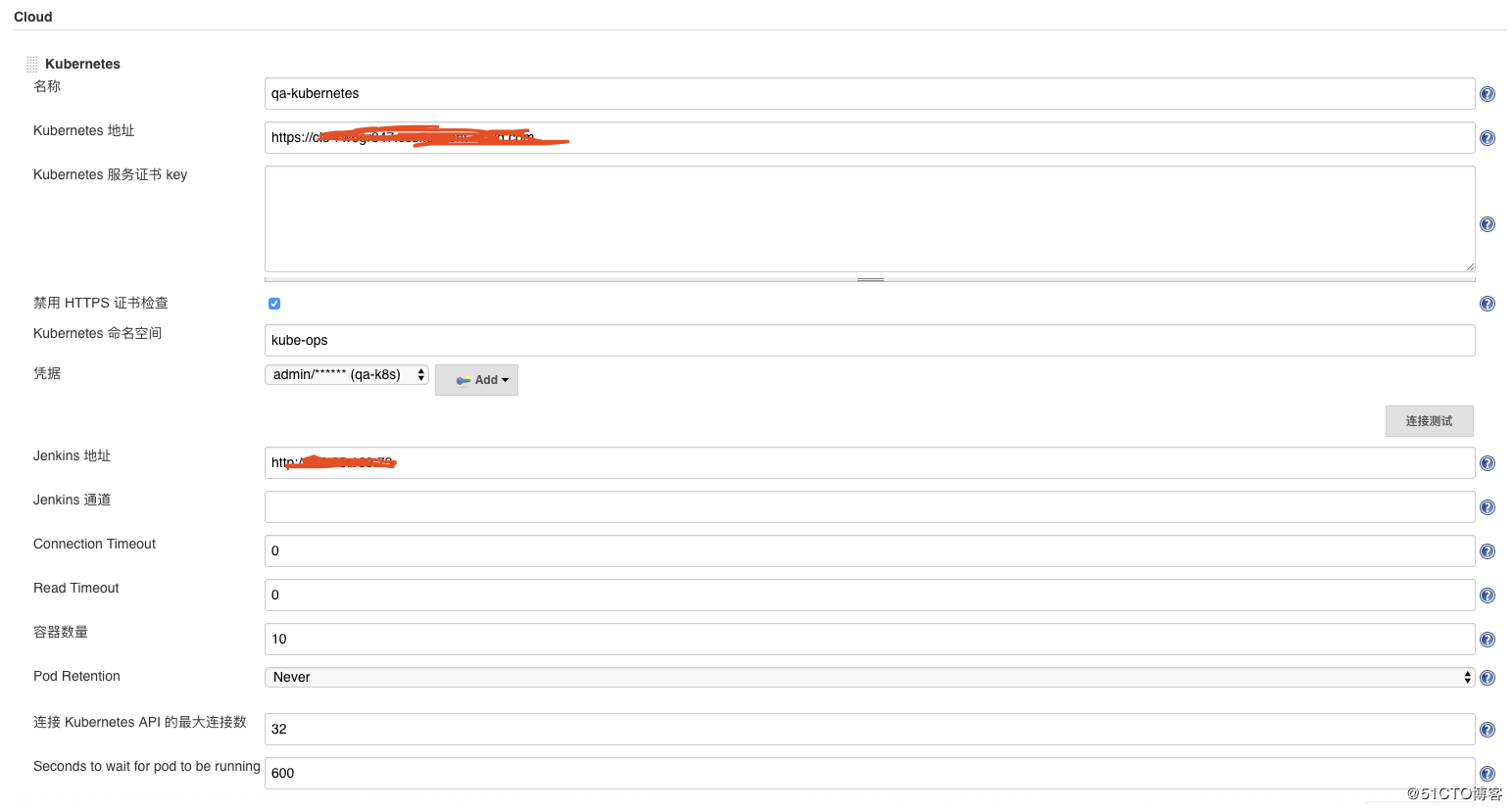 划重点!!!:jenkins地址,这里我这里写的是内网地址以及暴露了50000端口(用来与slave 建立通信使用),因为master 和slave 分别在不通的**s 集群里,那么需要远程进行联通,而jenkins-ui 我是以ingress 的方式对外暴露