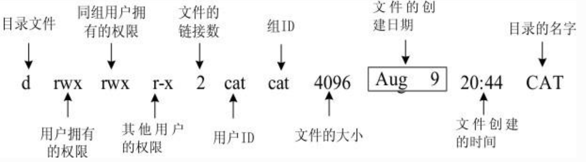 文本文件与目录文件的区别就在于第一个描述符不同,目录则以“d”为描述符。如图所示,这是之前所创建的一个名为CAT的目录,该目录的详细信息及相关介绍如下所示。