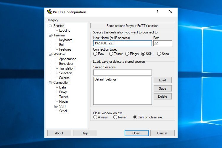 启动 Putty 并在 Host name (or IP address) 字段中输入 SSH 服务器 IP 地址。