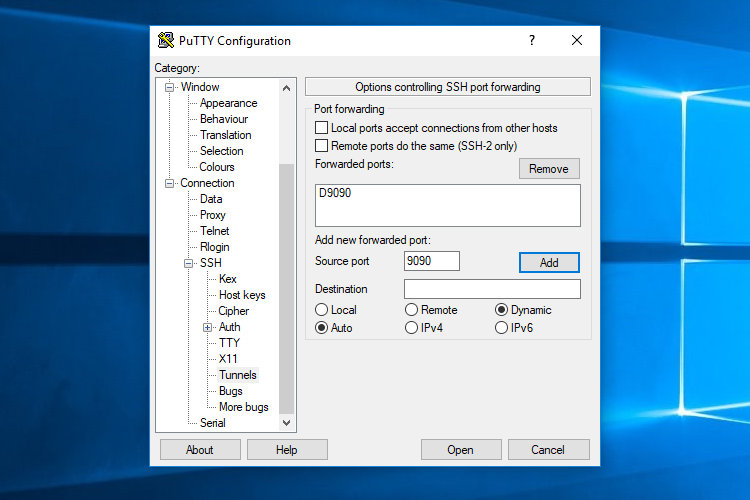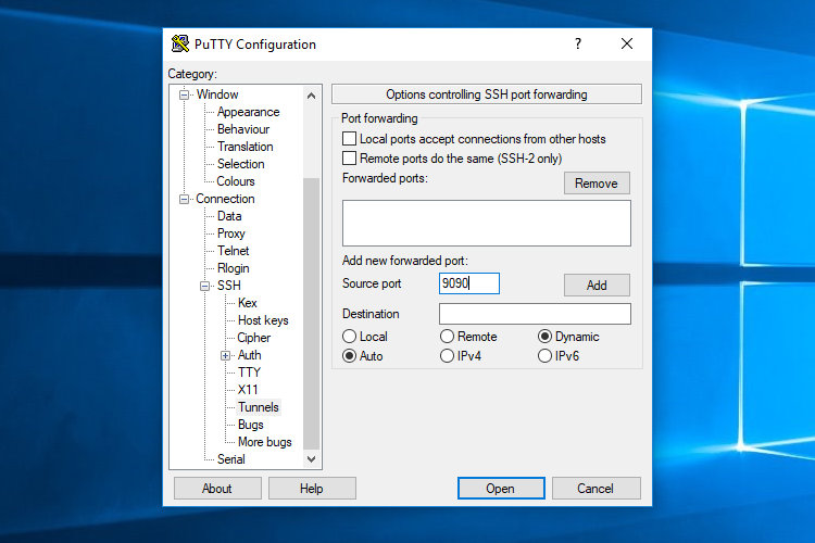 在 Connection 菜单下,展开 SSH 并选择 Tunnels 。检查 Local 单选按钮以设置本地, Remote 远程和 Dynamic 动态端口转发。