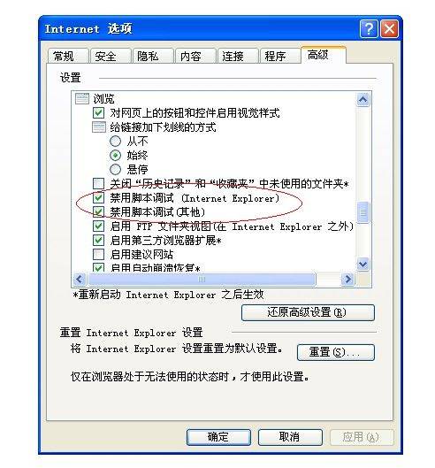 首先在IE浏览器的【工具】【Internet选项】的【高级】里禁用脚本调试。