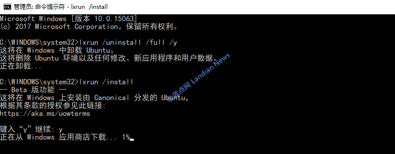 C:\WINDOWS\system32>lxrun /install -- Beta 版功能 -- 这将在 Windows 上安装由 Canonical 分发的 Ubuntu,根据其条款的授权参见此链接:http://www.51sjk.com/Upload/Articles/1/0/327/327490_20220921102614918.jpg 键入“y”继续: y 正在从 Windows 应用商店下载... 77% 不卸载直接升级Ubuntu 14.04: root@landian: $sudo do-release-upgrade