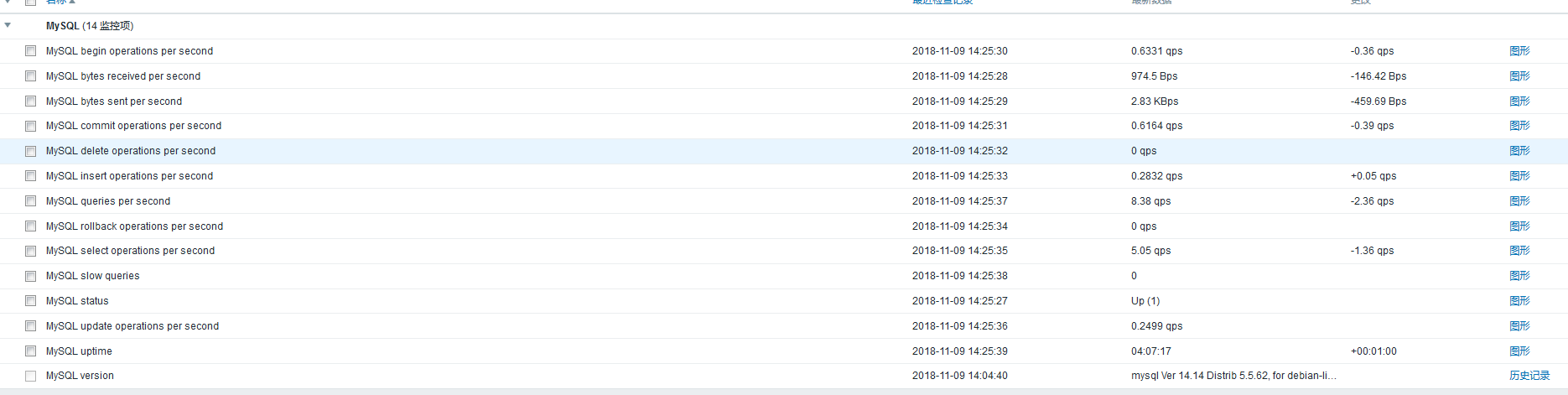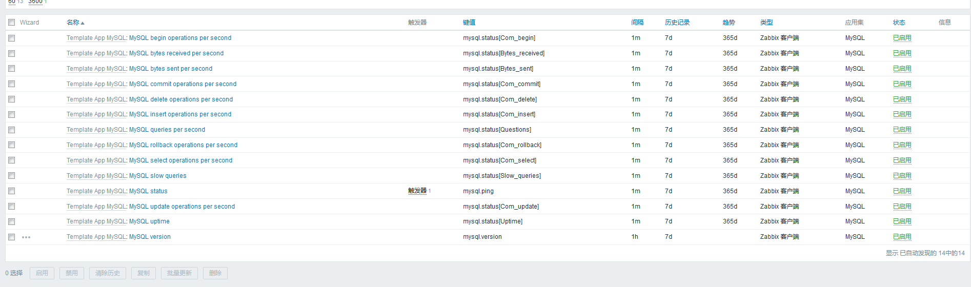 服务器: ubuntu14.04 之前装过 zabbix-agent 但是看了一下版本是2.2的,已经很落后了,于是升级了一下。(配置文件不用备份,升级会帮你自动备份) 升级后发现多了 /etc/zabbix/zabbix_agentd.d 目录下有个文件 userparameter_mysql.conf 在/etc/zabbix 目录下创建 .my.cnf 文件 ,文件内容为: root@xx:/etc/zabbix/zabbix_agentd.d# cat ../.my.cnf [client] user=zabbix password=zabbix 上面是你连接mysql的 用户和密码,所以要在 mysql 里 授权允许连接的 然后修改 userparameter_mysql.conf 文件, 把里面的指向路径全部改为/etc/zabbix/ ,让.my.cnf 文件生效 sed -i 's|/var/lib/zabbix|/etc/zabbix|g' userparameter_mysql.conf 重启 agent服务 服务器端就配置完成了