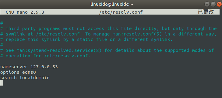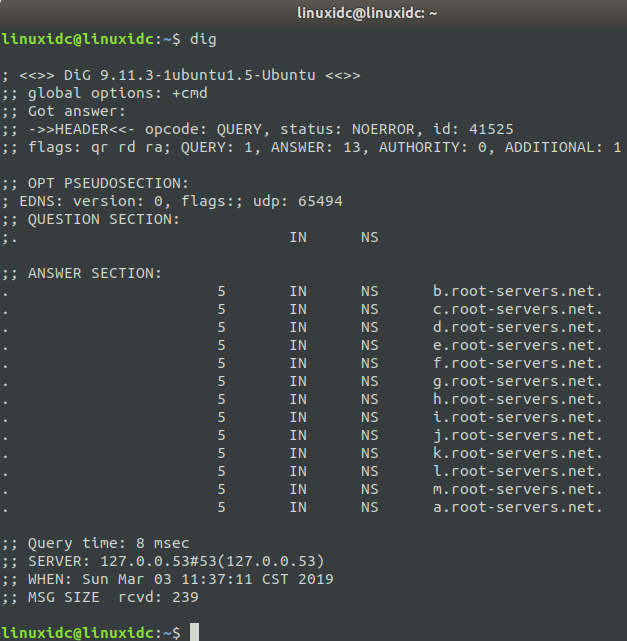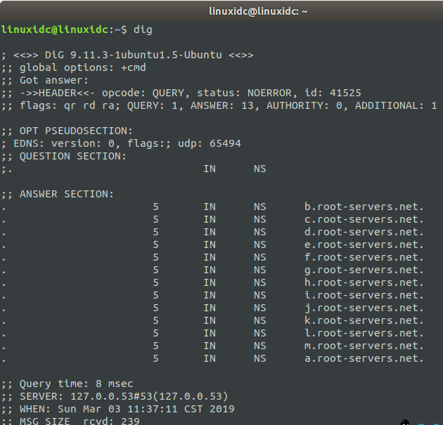 linuxidc@linuxidc:~$ dig ; < <>> DiG 9.11.3-1ubuntu1.5-Ubuntu < <>> ;; global options: +cmd ;; Got answer: ;; ->>HEADER< <- opcode: QUERY, status: NOERROR, id: 41525 ;; flags: qr rd ra; QUERY: 1, ANSWER: 13, AUTHORITY: 0, ADDITIONAL: 1 ;; OPT PSEUDOSECTION: ; EDNS: version: 0, flags:; udp: 65494 ;; QUESTION SECTION: ;. IN NS ;; ANSWER SECTION: . 5 IN NS b.root-servers.net. . 5 IN NS c.root-servers.net. . 5 IN NS d.root-servers.net. . 5 IN NS e.root-servers.net. . 5 IN NS f.root-servers.net. . 5 IN NS g.root-servers.net. . 5 IN NS h.root-servers.net. . 5 IN NS i.root-servers.net. . 5 IN NS j.root-servers.net. . 5 IN NS k.root-servers.net. . 5 IN NS l.root-servers.net. . 5 IN NS m.root-servers.net. . 5 IN NS a.root-servers.net. ;; Query time: 8 msec ;; SERVER: 127.0.0.53#53(127.0.0.53) ;; WHEN: Sun Mar 03 11:37:11 CST 2019 ;; MSG SIZE rcvd: 239