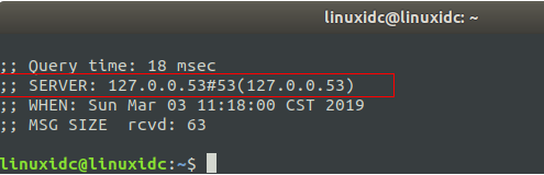 linuxidc@linuxidc:~$ dig www.linuxidc.com ; < <>> DiG 9.11.3-1Ubuntu1.5-Ubuntu < <>> www.linuxidc.com ;; global options: +cmd ;; Got answer: ;; ->>HEADER< <- opcode: QUERY, status: NOERROR, id: 17774 ;; flags: qr rd ra; QUERY: 1, ANSWER: 2, AUTHORITY: 0, ADDITIONAL: 1 ;; OPT PSEUDOSECTION: ; EDNS: version: 0, flags:; udp: 65494 ;; QUESTION SECTION: ;www.linuxidc.com. IN A ;; ANSWER SECTION: www.linuxidc.com. 5 IN A 122.228.238.15 www.linuxidc.com. 5 IN A 106.42.25.203 ;; Query time: 10 msec ;; SERVER: 127.0.0.53#53(127.0.0.53) ;; WHEN: Sun Mar 03 10:55:35 CST 2019 ;; MSG SIZE rcvd: 77