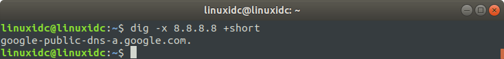 linuxidc@linuxidc:~$ dig -x 8.8.8.8 +short google-public-dns-a.google.com.