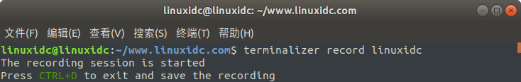 linuxidc@linuxidc:~/www.linuxidc.com$ terminalizer record linuxidc The recording session is started Press CTRL+D to exit and save the recording