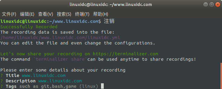 linuxidc@linuxidc:~/www.linuxidc.com$?terminalizer init