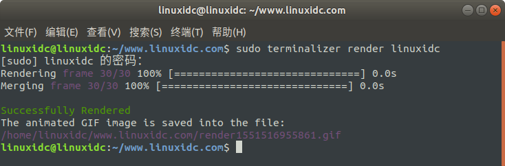 linuxidc@linuxidc:~/www.linuxidc.com$ sudo terminalizer render linuxidc [sudo] linuxidc 的密码: Rendering frame 30/30 100% [==============================] 0.0s Merging frame 30/30 100% [==============================] 0.0s Successfully Rendered The animated GIF image is saved into the file: /home/linuxidc/www.linuxidc.com/render1551516955861.gif