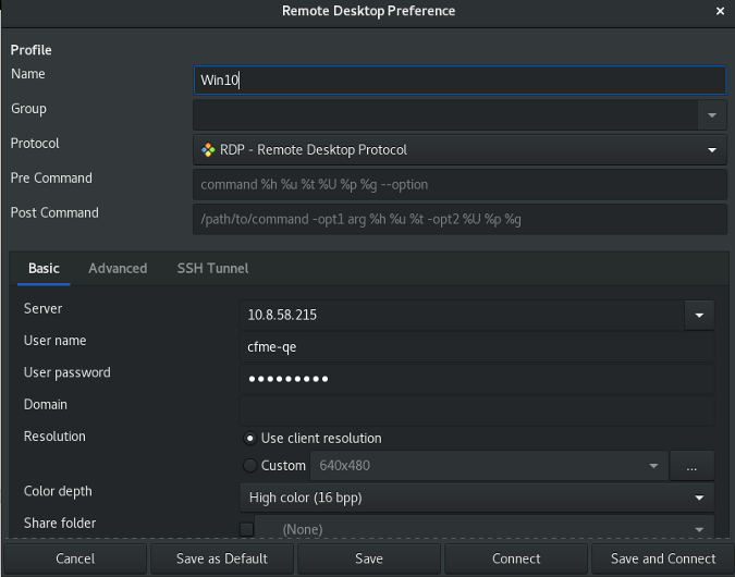你也可以通过点击左上角的“+”号创建保存过的连接。根据你的连接情况填好表单点击“保存”。以下是一个 Windows 10 RDP 连接的示例: