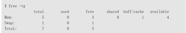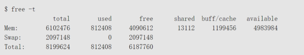 使用-t选项,free显示的值与没有选项时显示的值相同(不要混淆-t和tb),但是在输出的底部添加了一行。