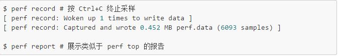 第二种用法,就是perf record和perf report。perf top虽然实时展示了系统的性能信息,但它的缺点是并不保存数据,也就是无法用于离线或者后续的分析,而record则提供了保存数据的功能,保存数据后,使用perf report解析展示。