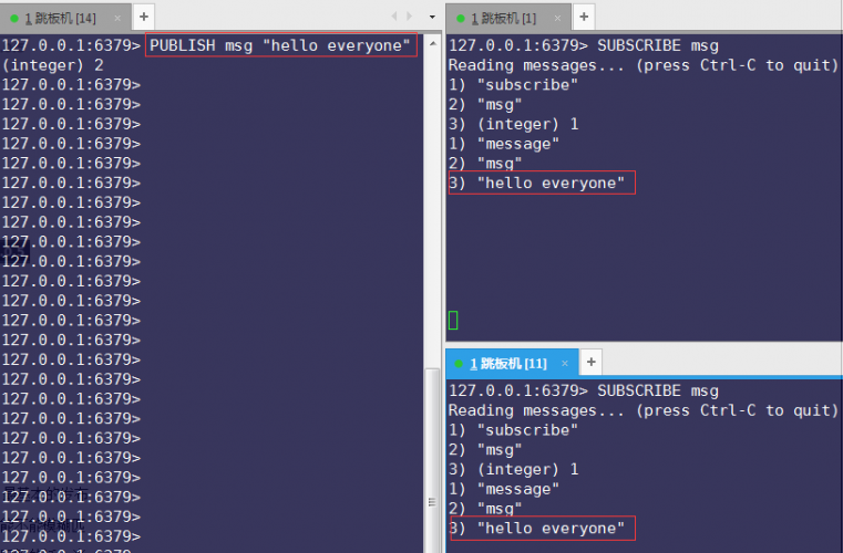 root@localhost:~ # redis-cli -p 6379 127.0.0.1:6379> SUBSCRIBE msg Reading messages... (press Ctrl-C to quit) 1) "subscribe" 2) "msg" 3) (integer) 1 root@localhost:~ # redis-cli -p 6379 127.0.0.1:6379> SUBSCRIBE msg Reading messages... (press Ctrl-C to quit) 1) "subscribe" 2) "msg" 3) (integer) 1