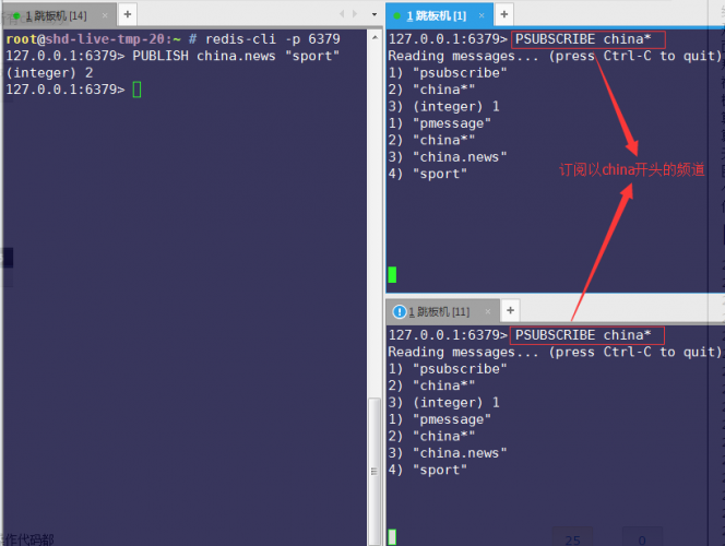看到上面的解释,你心里可能就在想,这不就是正则匹配么。。。而且前缀”P”就是Pattern的意思,对吧,接下来我就订阅一下所有china为前缀的channel。
