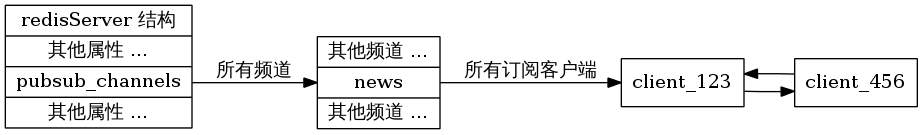 举个例子,如果在一个 redisServer 实例中,有一个叫做 news 的频道,这个频道同时被client_123 和 client_456 两个客户端订阅,那么这个 redisServer 结构看起来应该是这样子: