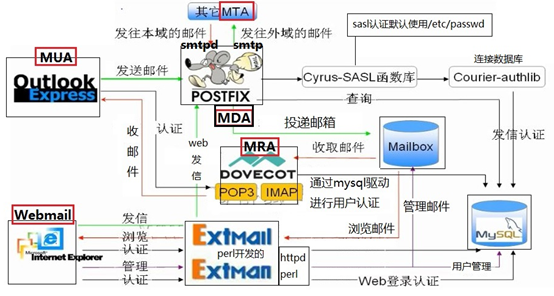 3、用户可以基于webmail进行收发邮件,同样通过Extmail/Extman到Mysql中认证,认证成功。就可以基于postfix发邮件,基于Dovecot收邮件。但是Extmail/Extman自身就可以到Mailbox中收取邮件。