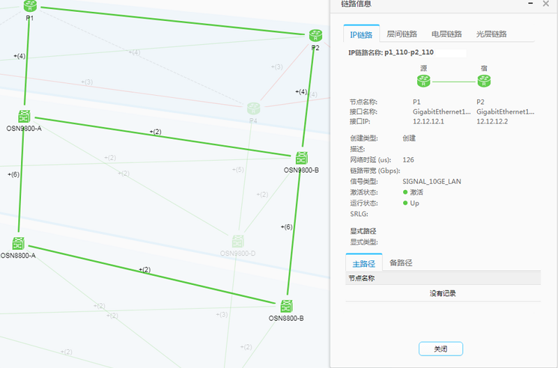 激活后,查看IP Link多层路径拓扑视图,可以呈现承载该IP Link的传送业务详细信息,及业务路径:光层路径/电层路径: