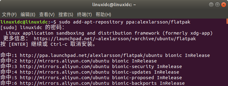 linuxidc@linuxidc:~$ sudo add-apt-repository ppa:alexlarsson/flatpak [sudo] linuxidc 的密码: Linux application sandboxing and distribution framework (formerly xdg-app) 更多信息: http://www.51sjk.com/Upload/Articles/1/0/328/328121_20220921122338185.jpg 按 [ENTER] 继续或 Ctrl-c 取消安装。 sudo apt update