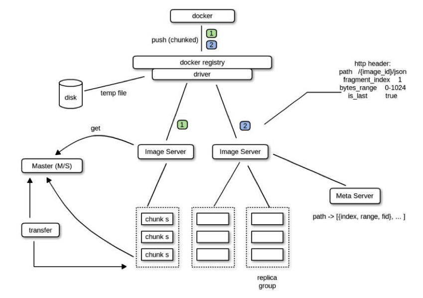ChunkServer与ChunkMaster组成了一个通用的对象存储服务,ChunkMaster是中心节点,缓存了所有ChunkServer的信息,ChunkServer本身是最终镜像数据落地的存储节点,多个ChunkServer会构成一个组,拥有唯一的组ID,上传这个组内的所有ChunkServer都成功才算成功,下载可以随机选择其中一个节点下载。