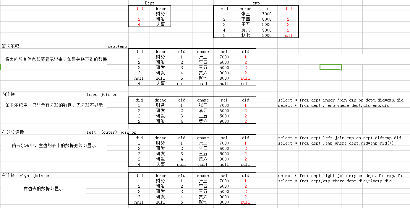 除将符合条件的行显示出来,还显示左表的全部行,而右表的字段拼接过去全为NULL。如下所示: