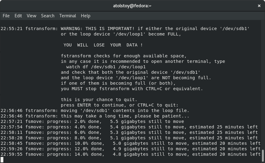 请注意,无法转换根文件系统,这是一种安全措施。请改用测试分区或实验性 USB 盘。与此同时,Fstransform 会在控制台中有许多辅助输出。最有用的部分是预计完成时间,让你随时了解该过程需要多长时间。同样,在几乎空的驱动器上的几个小文件将使 Fstransform 在一分钟左右完成其工作,而更多真实世界的任务可能需要数小时的等待时间。
