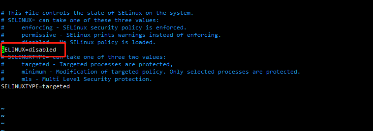 2.需要关闭SELinux,打开配置文件:vim /etc/selinux/config,设置SELINUX=disabled,保存退出:wq