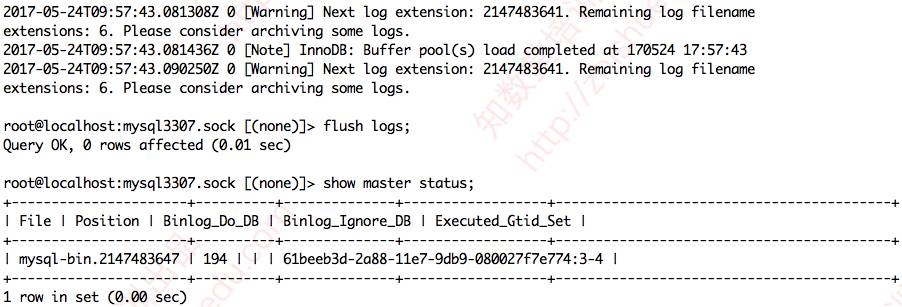 我们多执行几次 FLUSH LOGS,切换日志,直到序号达到最大值,看看会发生什么: