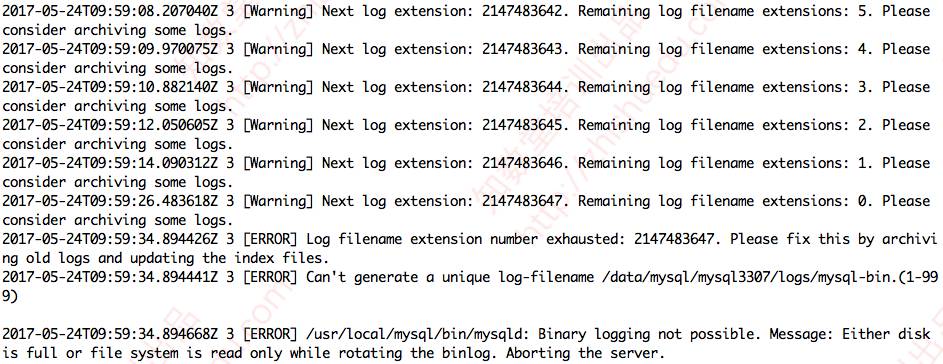 5.由此可见有两个隐患,当binlog文件数目过大,会导致binlog切换效率较低。当binlog文件最大序号快达到最大值时,离mysqld进程挂掉就不远了,需要加急处理。
