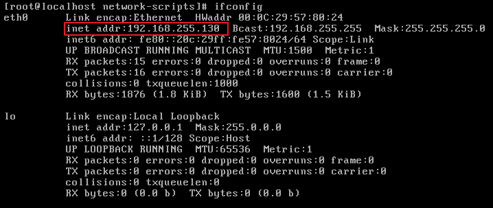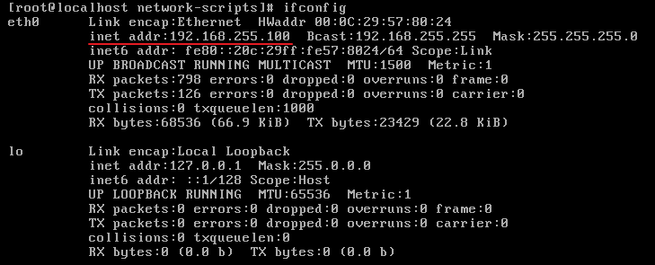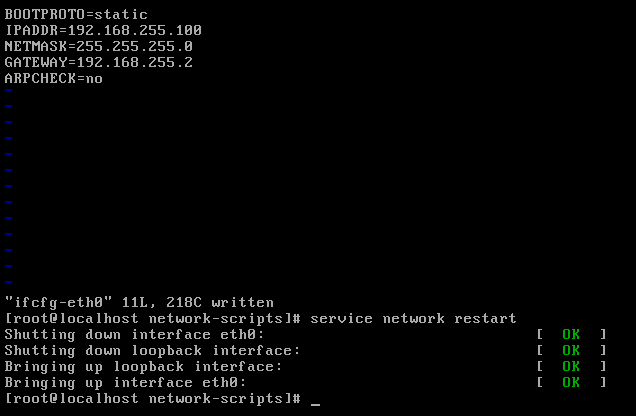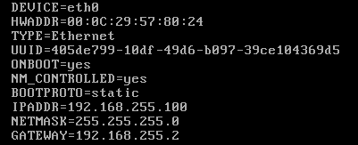 IPADDR=192.168.255.100(根据网关自行调整) NETMASK=255.255.255.0 GATEWAY=192.168.255.2