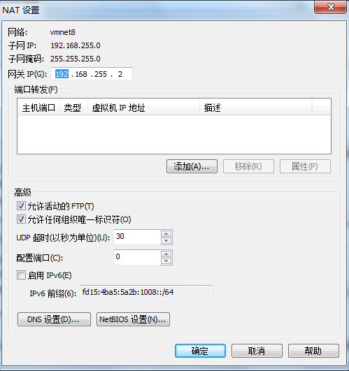 虚拟机-->编辑-->虚拟网络编辑器-->vmnet8-->nat设置