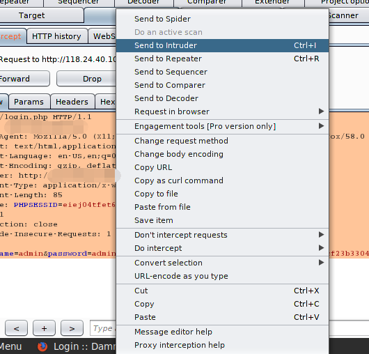 默认为我们面对一个未知系统的情况,使用intruder功能对username/password进行爆破