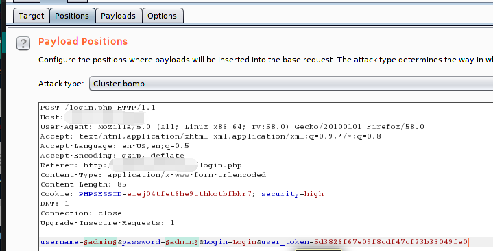 Cluster bomb – 这种模式会使用多个payload组。每个定义的位置中有不同的payload组。攻击会迭代每个payload组,每种payload组合都会被测试一遍。这种攻击适用于那种位置中需要不同且不相关或者未知的输入的攻击。攻击请求的总数是各payload组中payload数量的乘积。