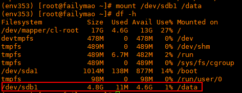 分区: fdisk /dev/sdb (sdb, sdc, sde) 指令:m(帮助信息), n (新加分区) 第二步: 指令p (主分区) 第三步:写入磁盘 w 使用:挂载: mount /dev/sdb1 /data/ 挂载到/data目录下,挂载成功如下