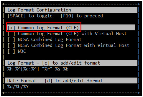 当你第一次启动GoAccess,你将会看到如下的屏幕中选择日期和日志格式。正如前面所述,你可以按空格键进行选择,并按F10确认。至于日期和日志格式,你可能需要参考Apache 文档来刷新你的记忆。
