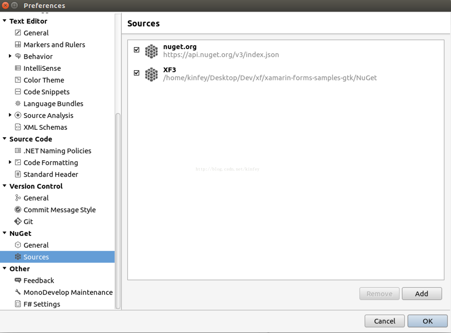 Nuget配置,由于现在Xamarin.Forms在很早的阶段,所以不存在在Nuget上,但你可以通过刚才提到的示例,做一个本地Nuget(Sample中Nuget 文件夹包含了Xamarin.Forms 3.0, Xamarin.Forms.GTK等新的包)。打开MonoDevelop通过Tools -> Add Custom Tool -> Nuget -> Source 引入。