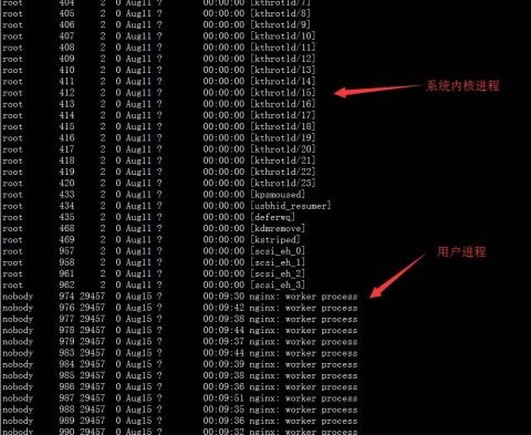 而这些系统级的内核进程都是会用中括号括起来的,它们会执行一些系统的辅助功能(如将缓存写入磁盘);无括号的进程都是用户们执行的进程(如php、nginx等)。