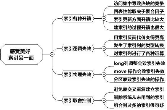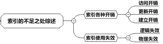 关于索引的不足之处,我们可以从索引的开销和容易失效这两个方面来讨论,如下图所示: