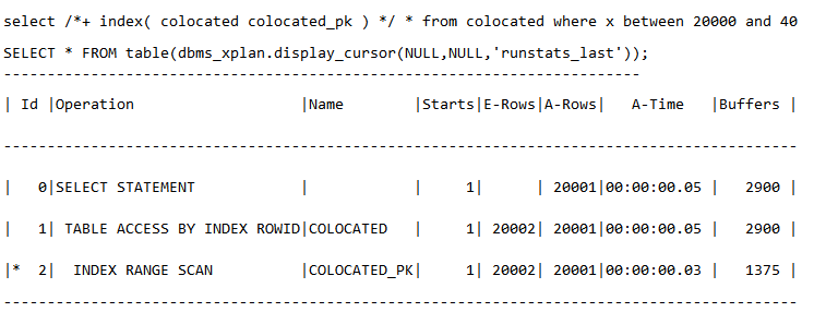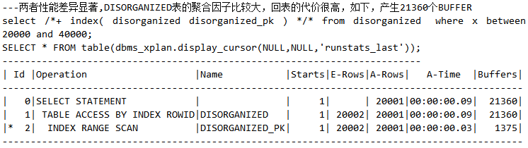 结论:索引查询要尽可能避免回表,如果不可避免,则需要关注聚合因子是否过大。(注:这个例子在前面的章节已经说过了,这里就不再详述了。)在该例子中,构造脚本organized表的聚合因子比较小,回表的代价较低,产生了2900个buffer,如下: