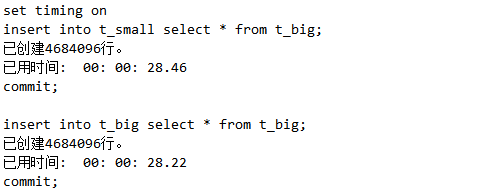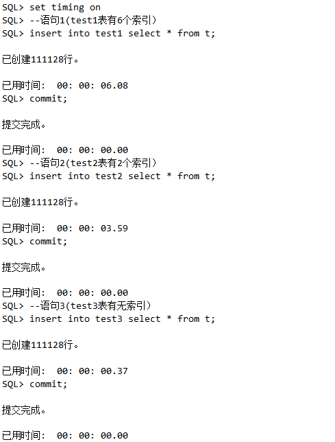 由上面代码可以看出,虽然t_small是小表,t_big是大表。但是插入一般不会随着记录的增加越插越慢。什么时候会越插越慢,就是当表有索引的时候。因为索引需要维护,越大维护越困难。我们继续做一组试验。