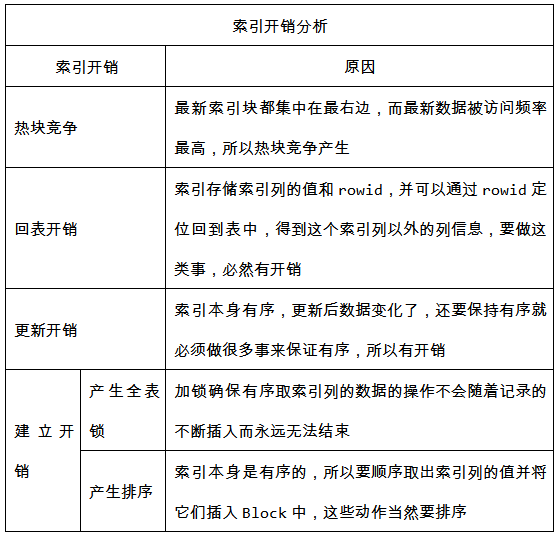 还有千万别忽略了建立索引的开销,这也和索引的有序性有关。我们在建索引的过程中,首先把索引列的数据排序提取出来,再插入到块中形成索引块,这时如果数据不断地插入,排序提取这个动作什么时候能结束呢?所以还必须要锁表,这就是一个很大的开销(Online建索引是一种特殊的思路,这里不做描述)。当然建索引过程中排序这个动作本身也是一个不小的开销。
