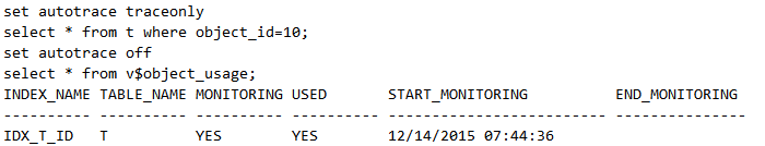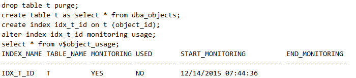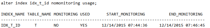 停止对索引的监控,观察v$object_usage状态变化,发现MONITORING的值为NO,且END_MONITORING记录了停止监控的时间,如下: