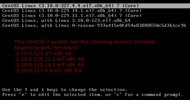 当系统引导时,你会在主控制台看到如下的 GRUB 画面。最开始,你可以根据提示在多个内核版本中选择一个内核(默认情况下,系统将会使用最新的内核启动),并且可以进入 GRUB 命令行模式(使用 c 键),或者编辑启动项(按下 e 键)。