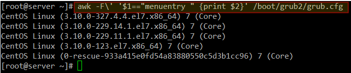 # awk -F/' '$1=="menuentry " {print $2}' /boot/grub2/grub.cfg