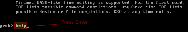 在启动画面中按下 c 键进入 GRUB 命令行模式(记住,你也可以按下 e 键编辑默认启动选项),并可以在 GRUB 提示中输入 help 命令获得可用命令:
