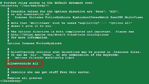确保为默认根文档目录 /var/www/html 设置 AllowOverride All,如下图所示: